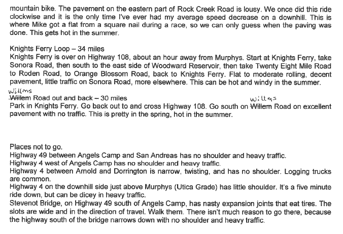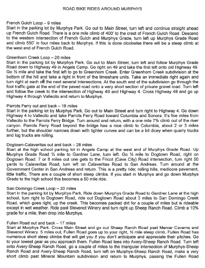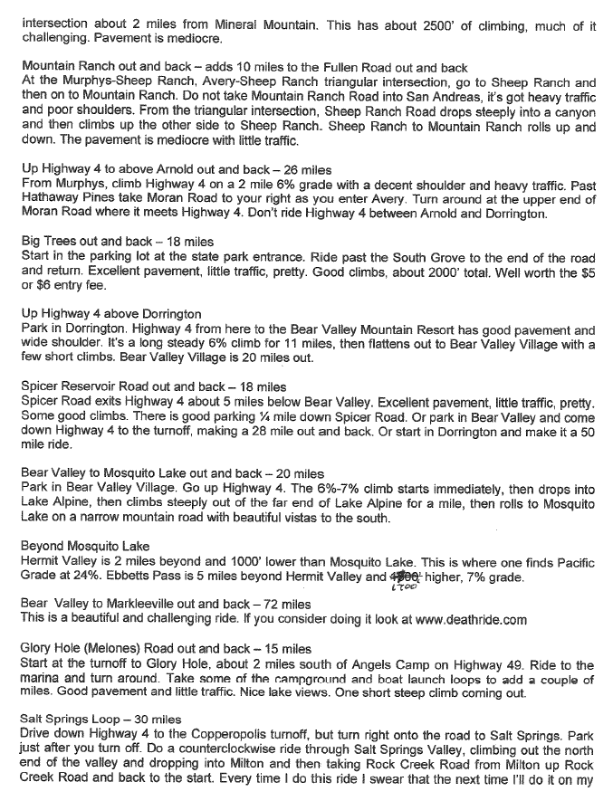 Dr. Dave Ritchie has made his time honored lost of (mostly) Calaveras County road rides available via pdf. This is a scan–images are pasted below; the pdf file is available via download: Road Bike Rides Around Murphy’s California